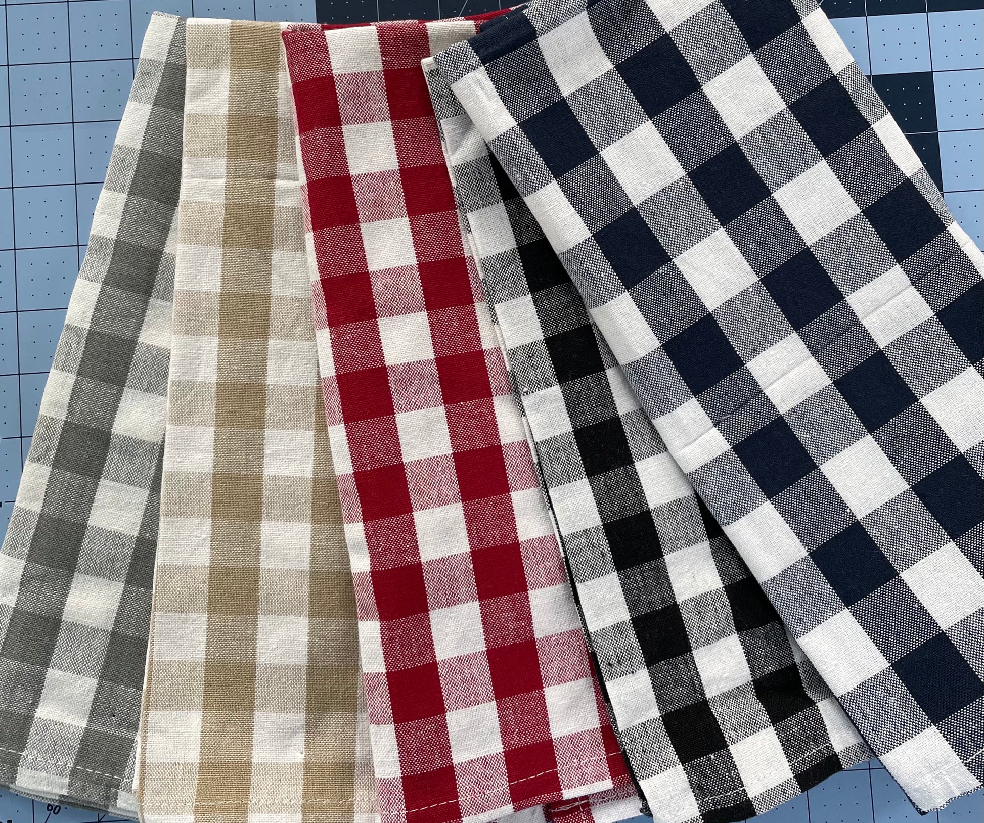 White, ivory or red terry towel; Red, black, blue, tan or gray plaid flour sack towel