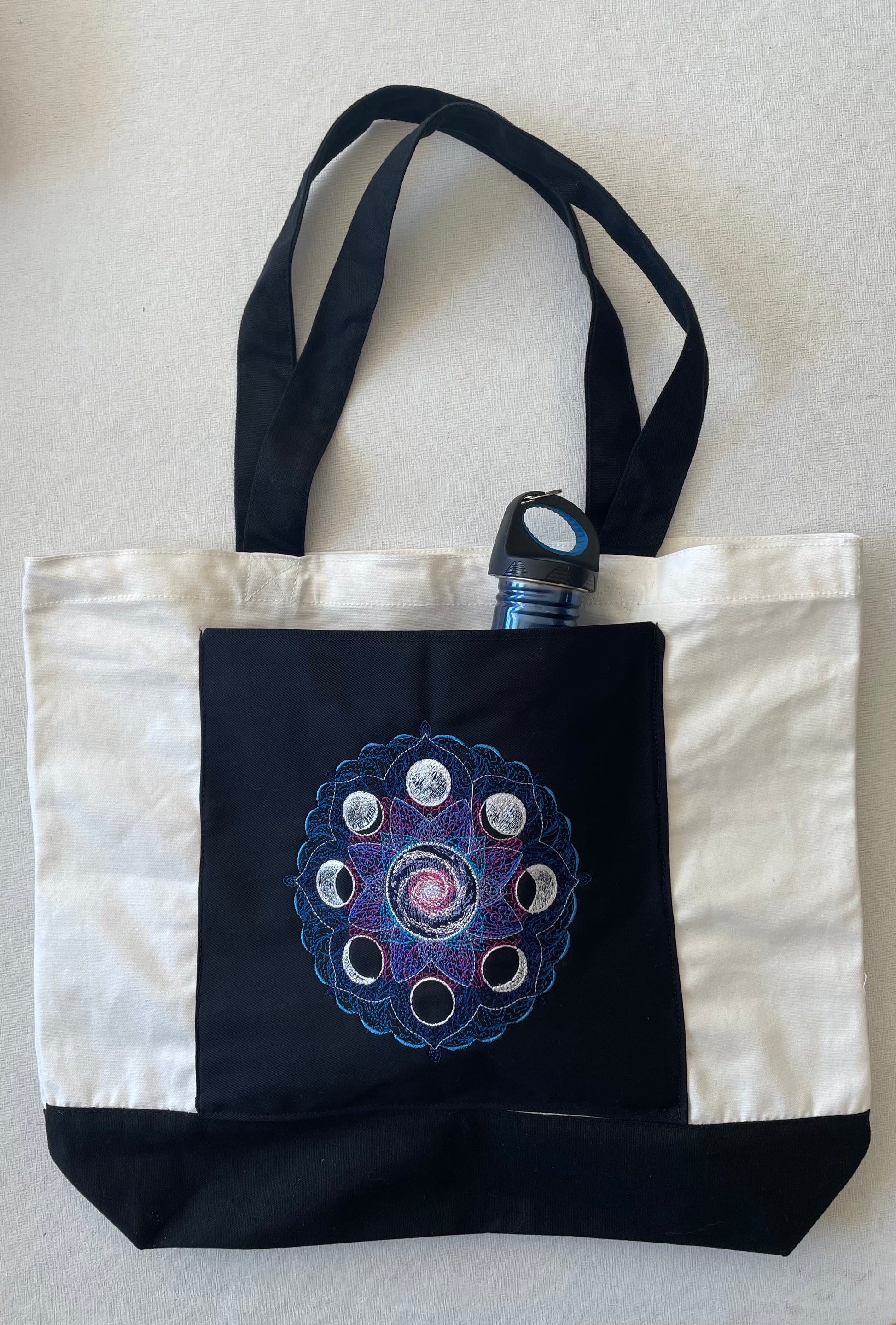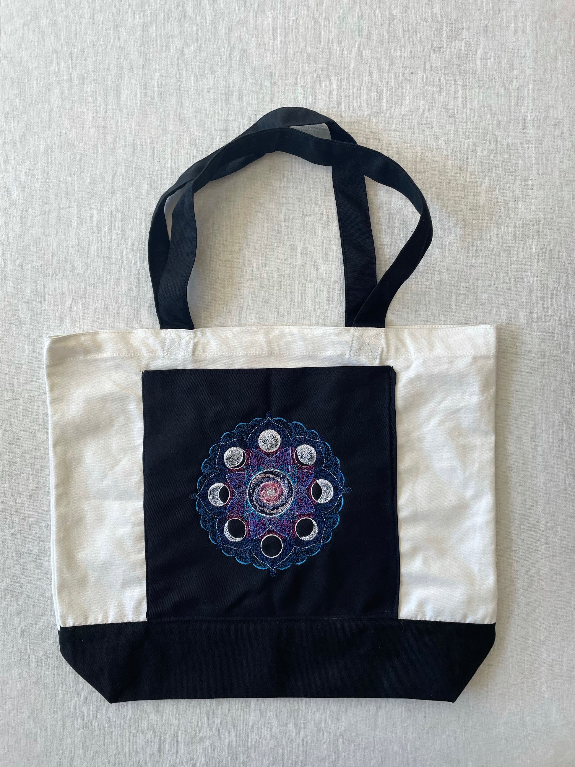 Truly unique. Large canvas carry all bag. Unique detailed moon phases embroidered on one side. Bag features black bottom and handles and large pocket for phone, keys, wallet, water bottle, etc.