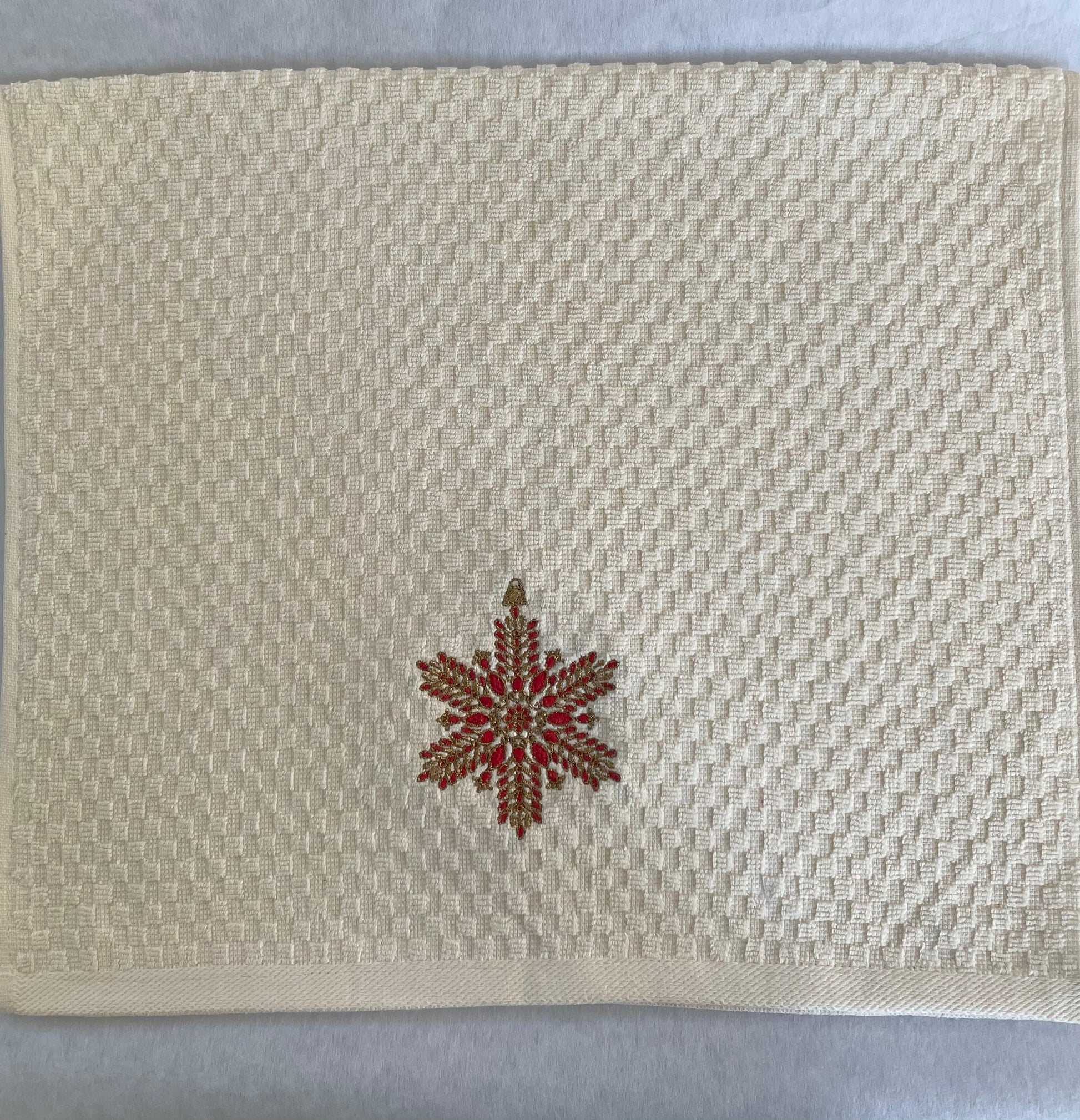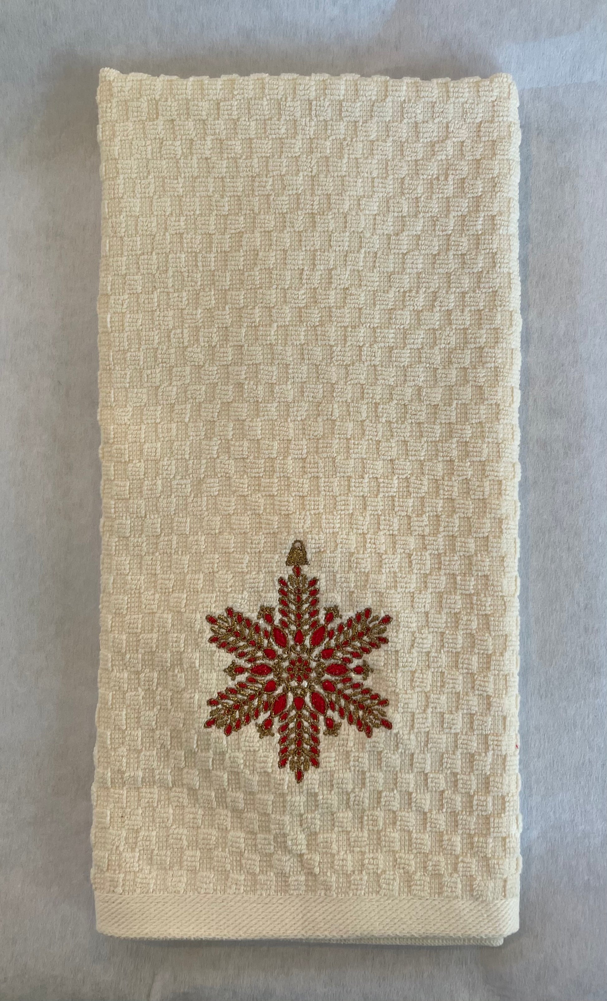 Exquisite Ruby Red and Gold Snowflake Ornament embroidered on cotton terry kitchen towel