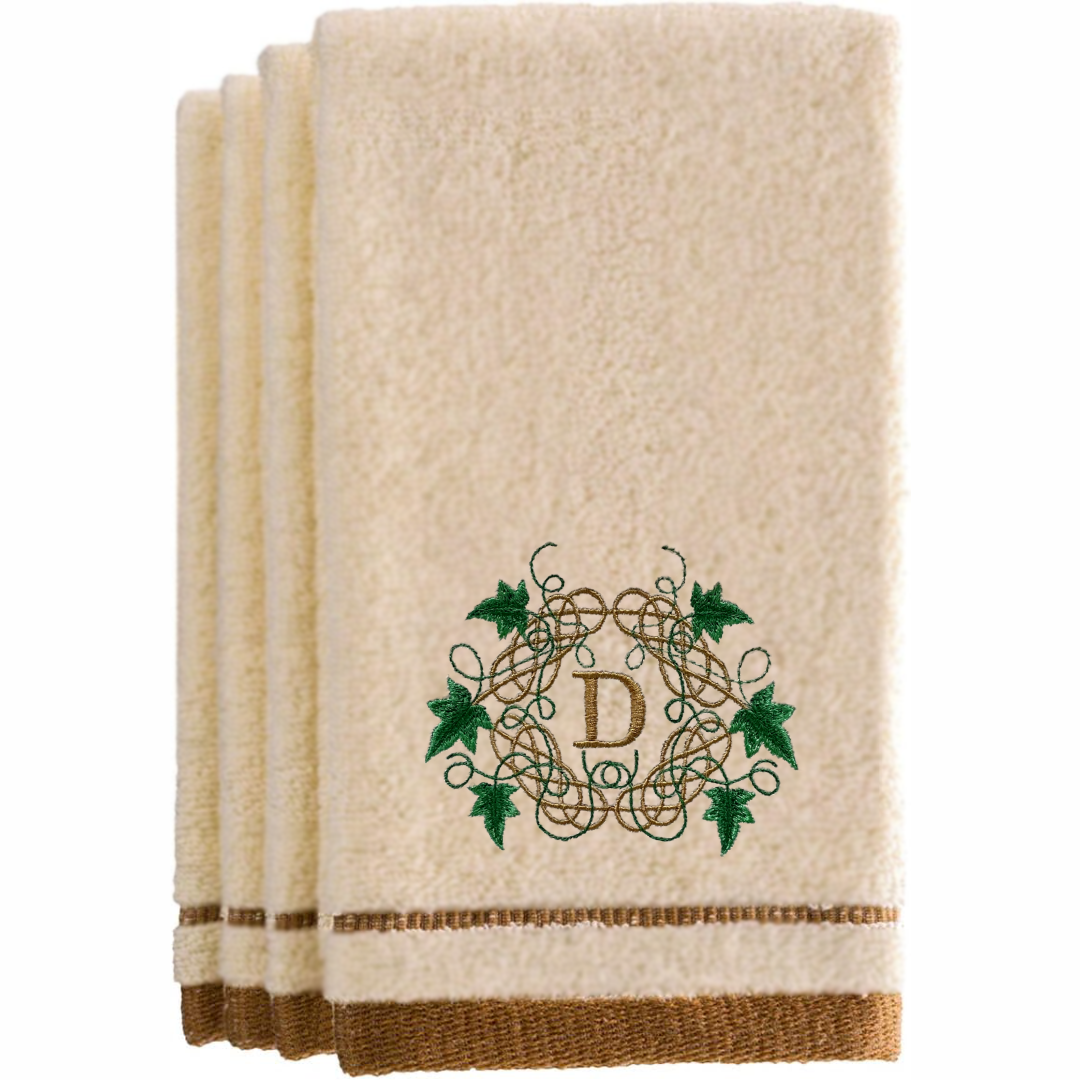 This meticulously crafted towel showcases expert embroidery work featuring an elegant Ivy and Celtic knot frame with custom monogram. Embroidered on 100% cotton, the towel delivers superior absorbency and durability while maintaining its softness through repeated washing.