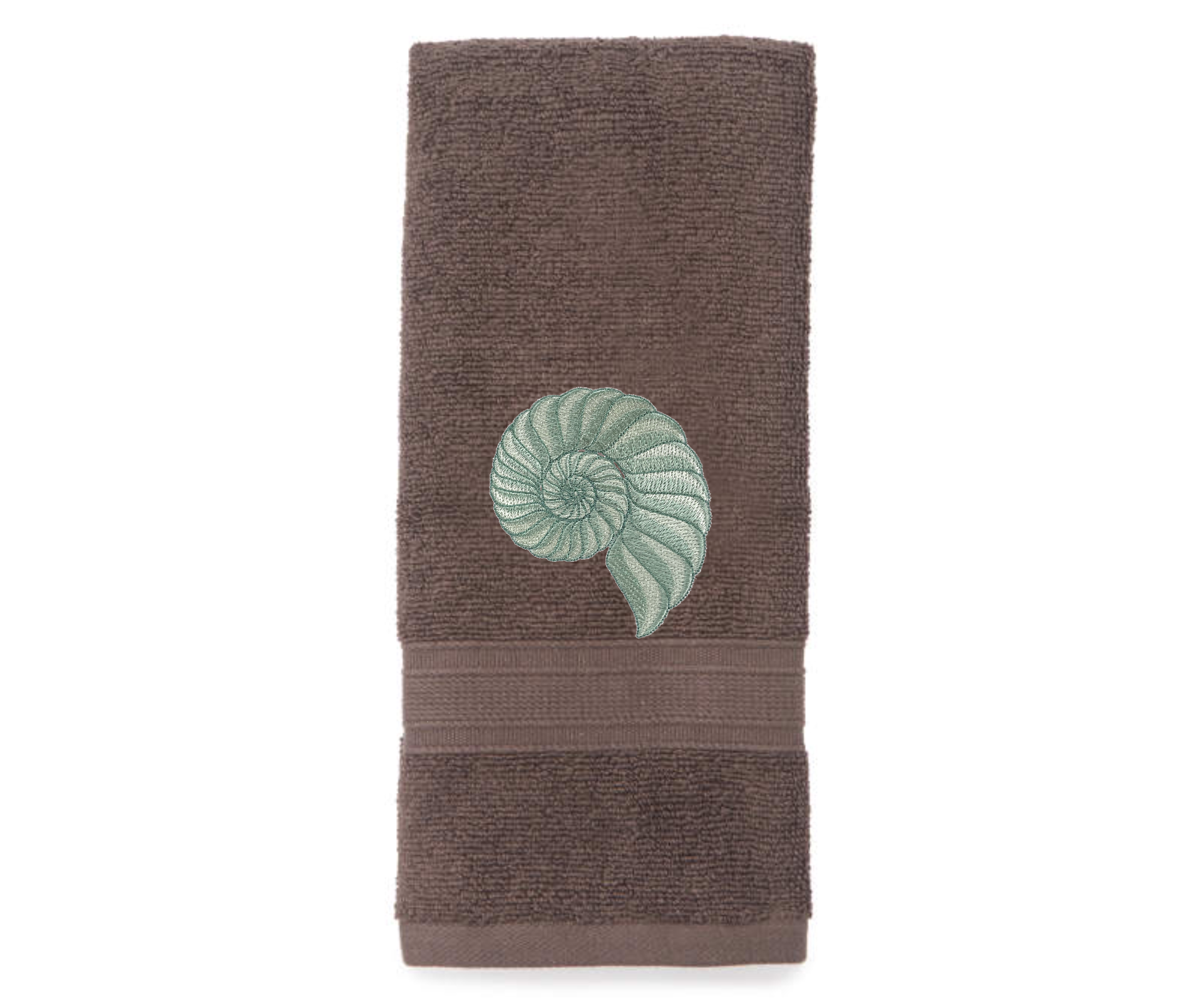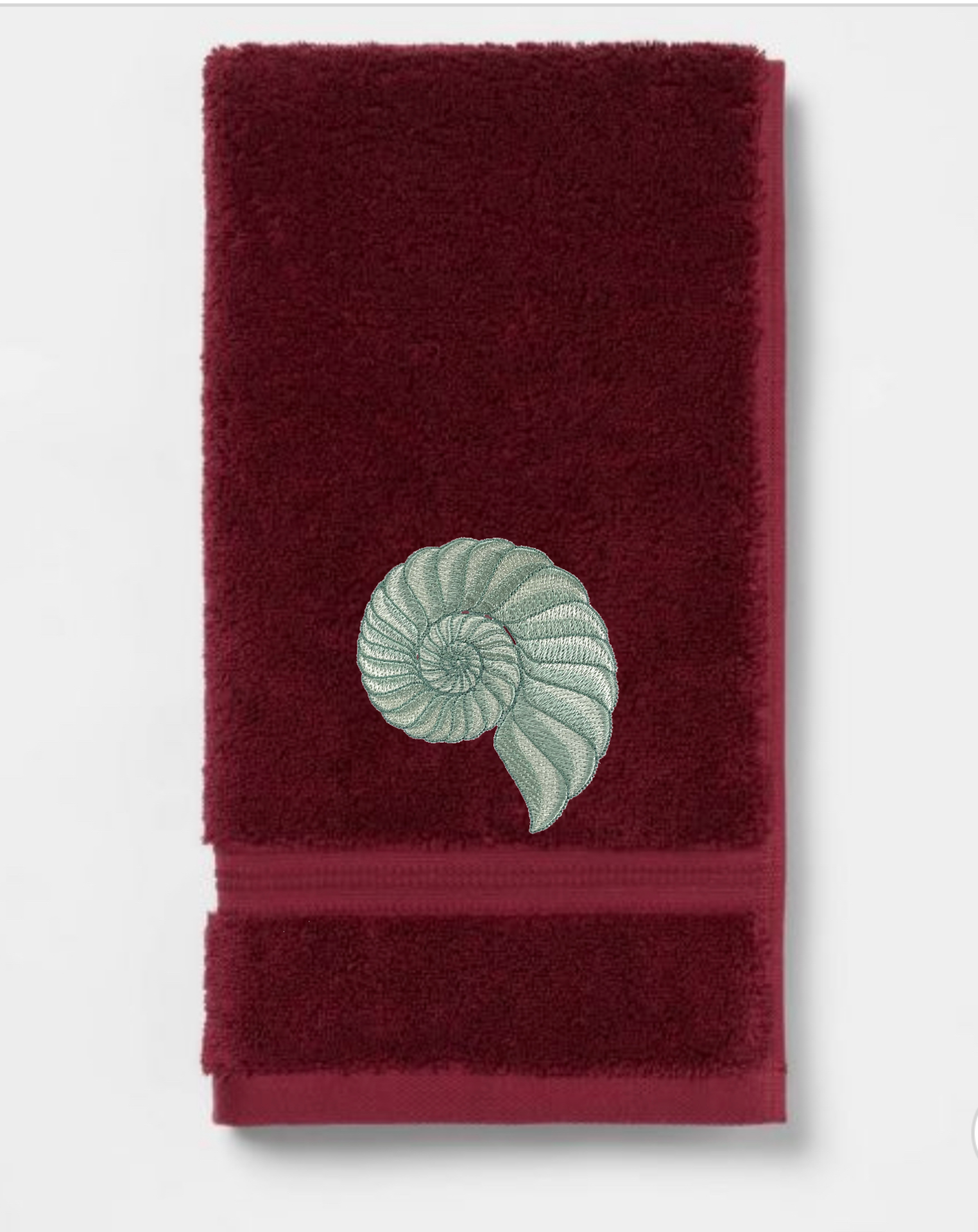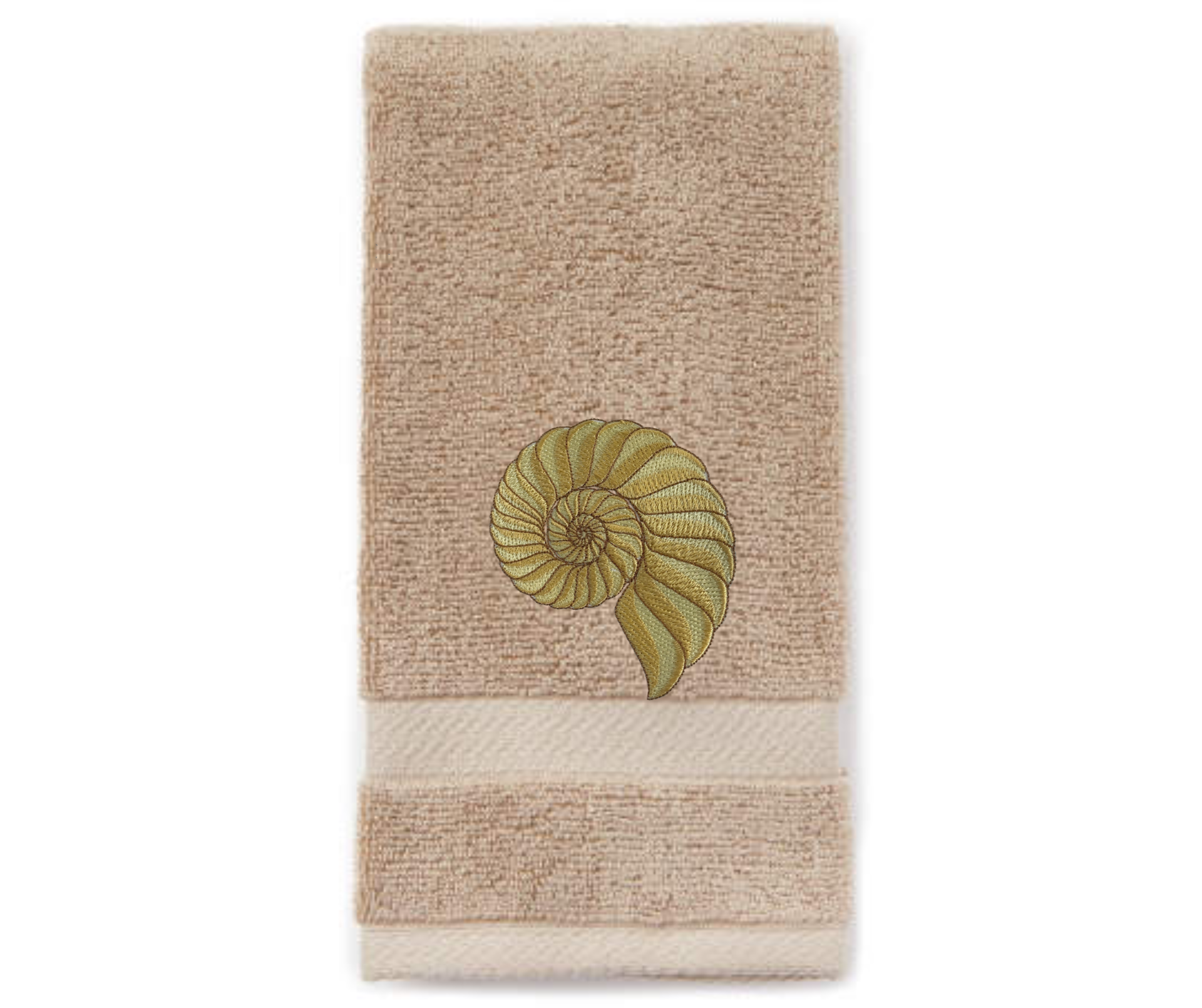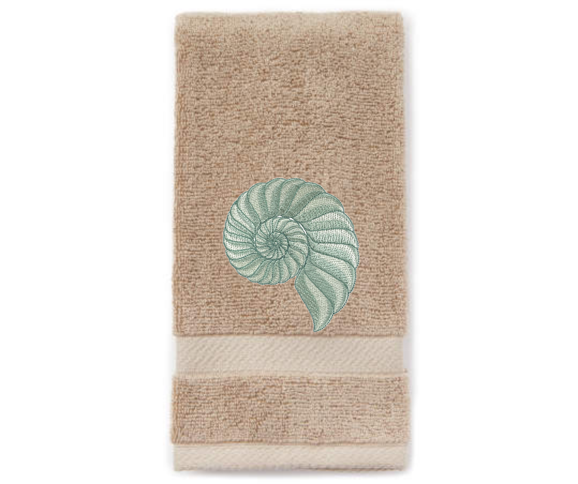 Embroidered Nautilus Shell Hand Towel. Elegant Nautilus in Beige or Green Embroidery with choice of towel color