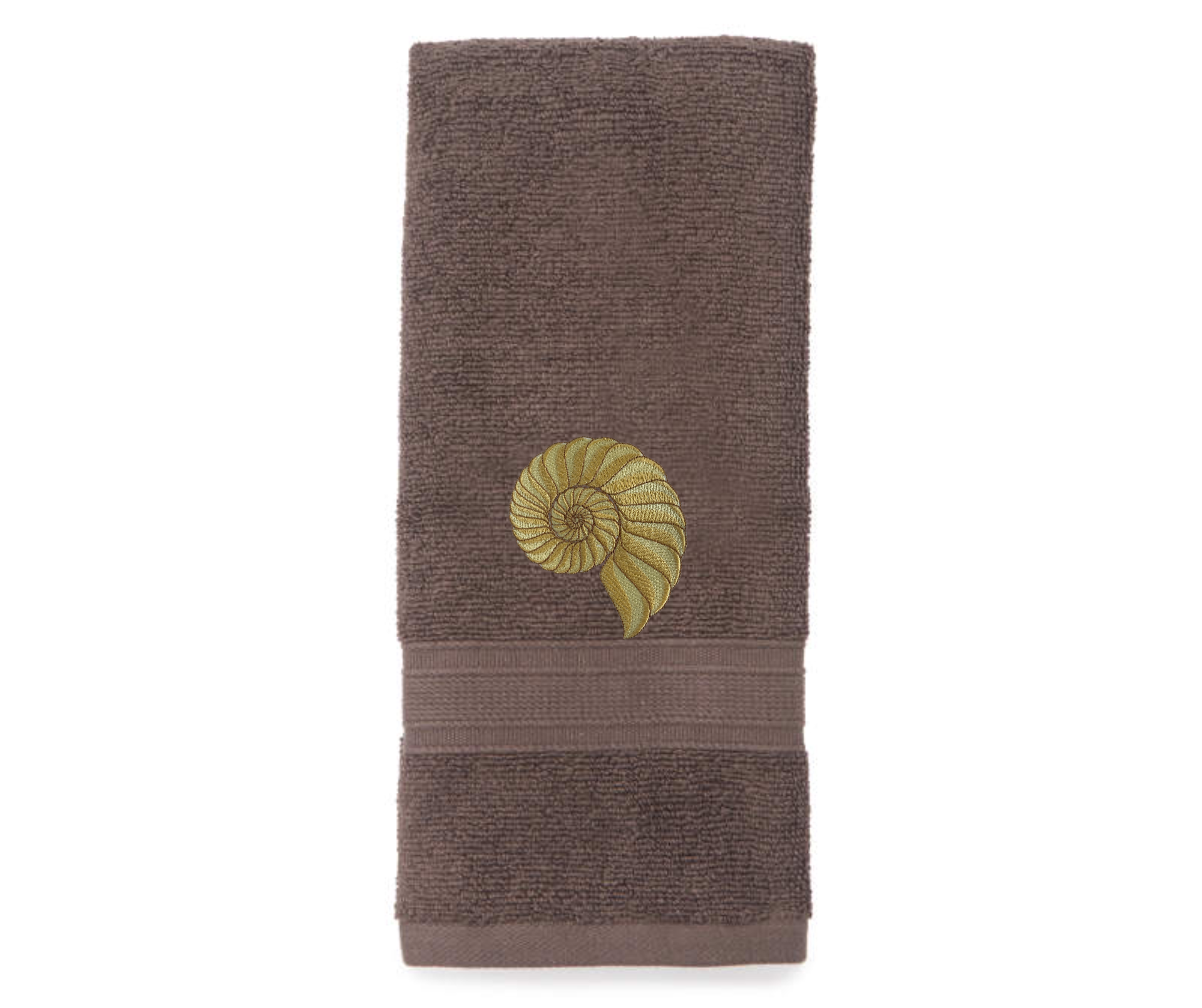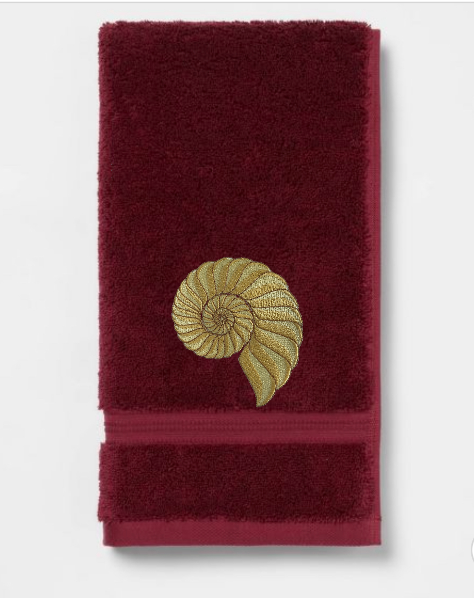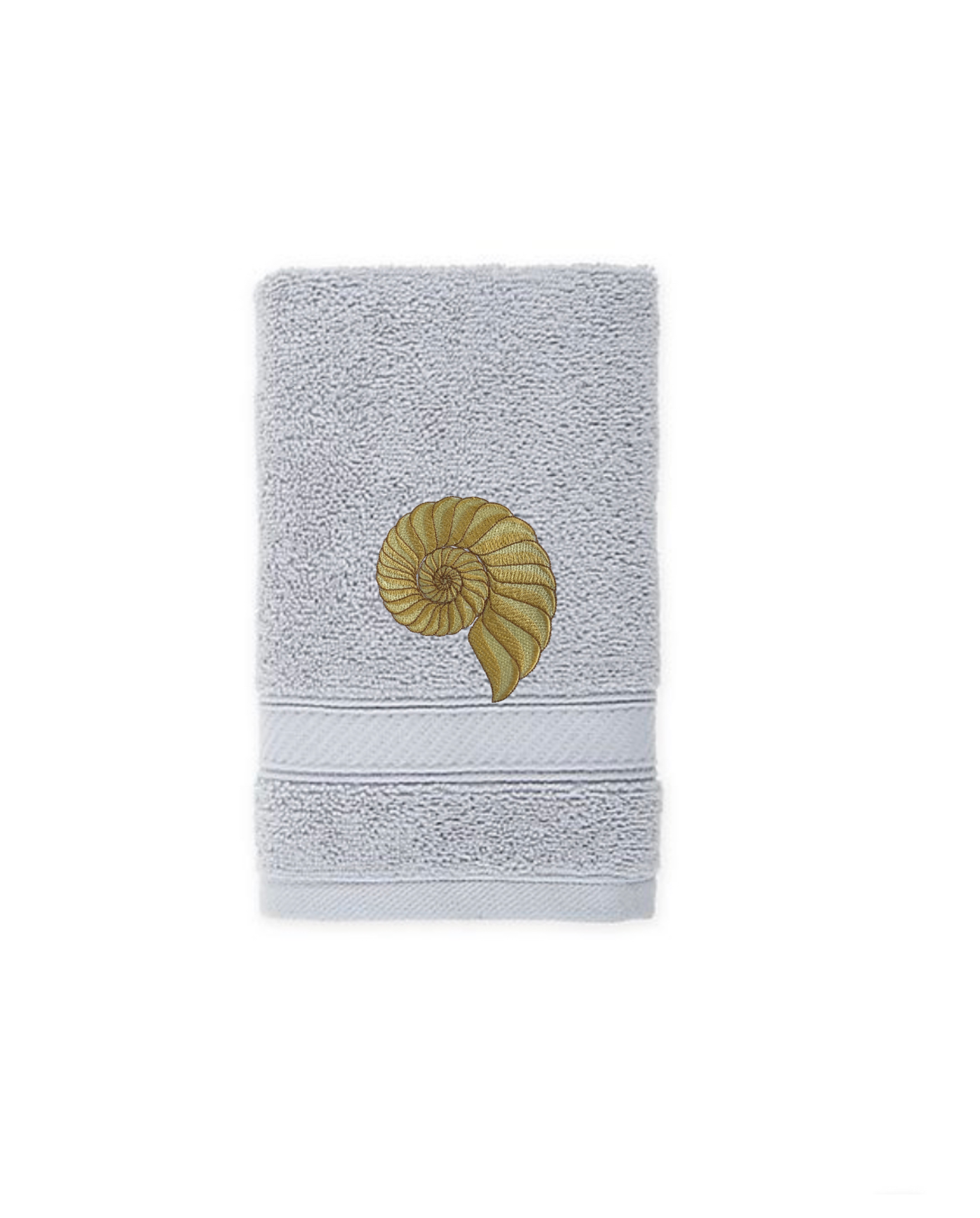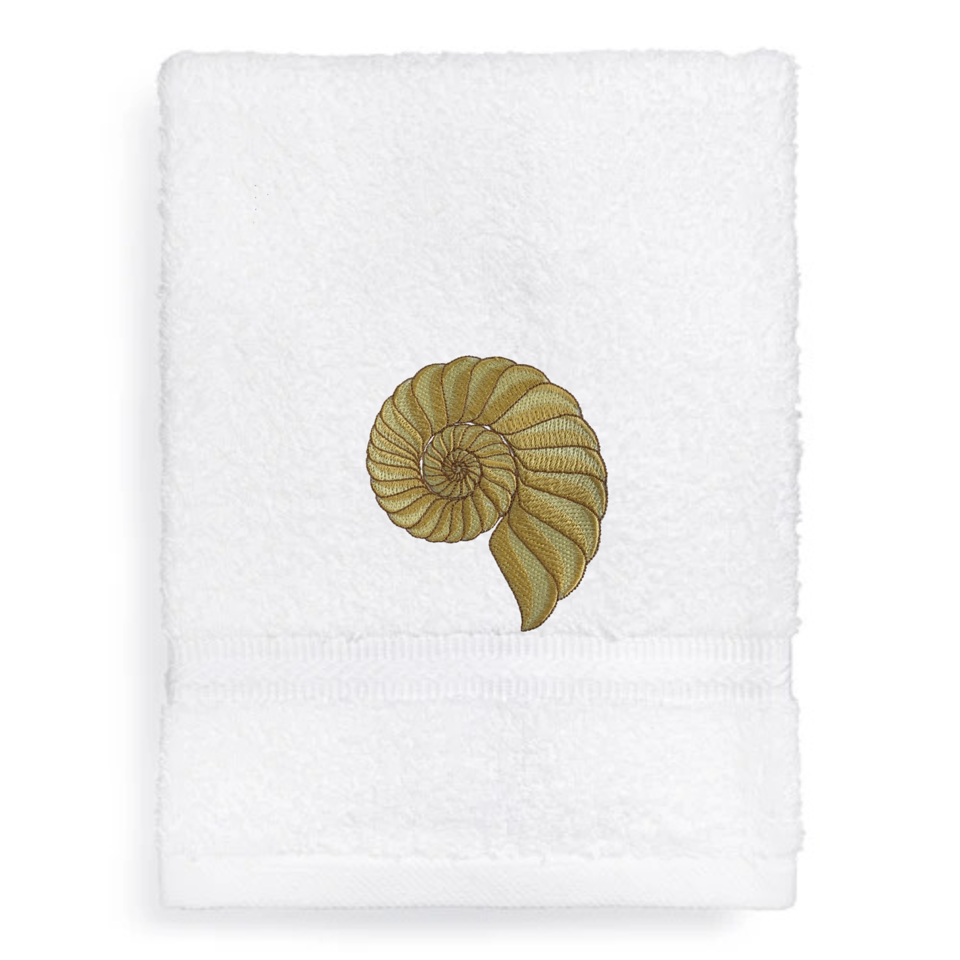 Embroidered Nautilus Shell Hand Towel. Elegant Nautilus in Beige or Green Embroidery with choice of towel color
