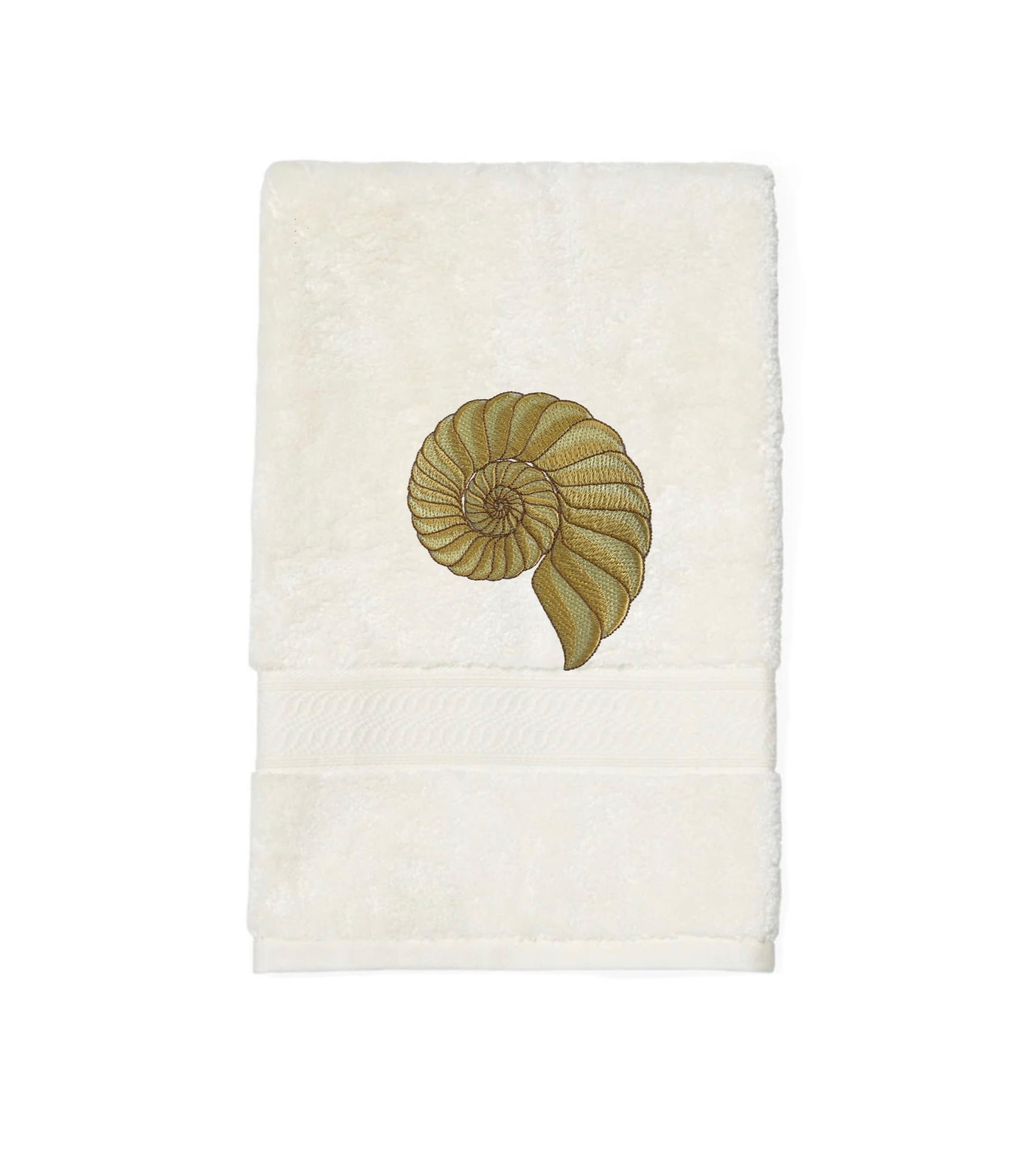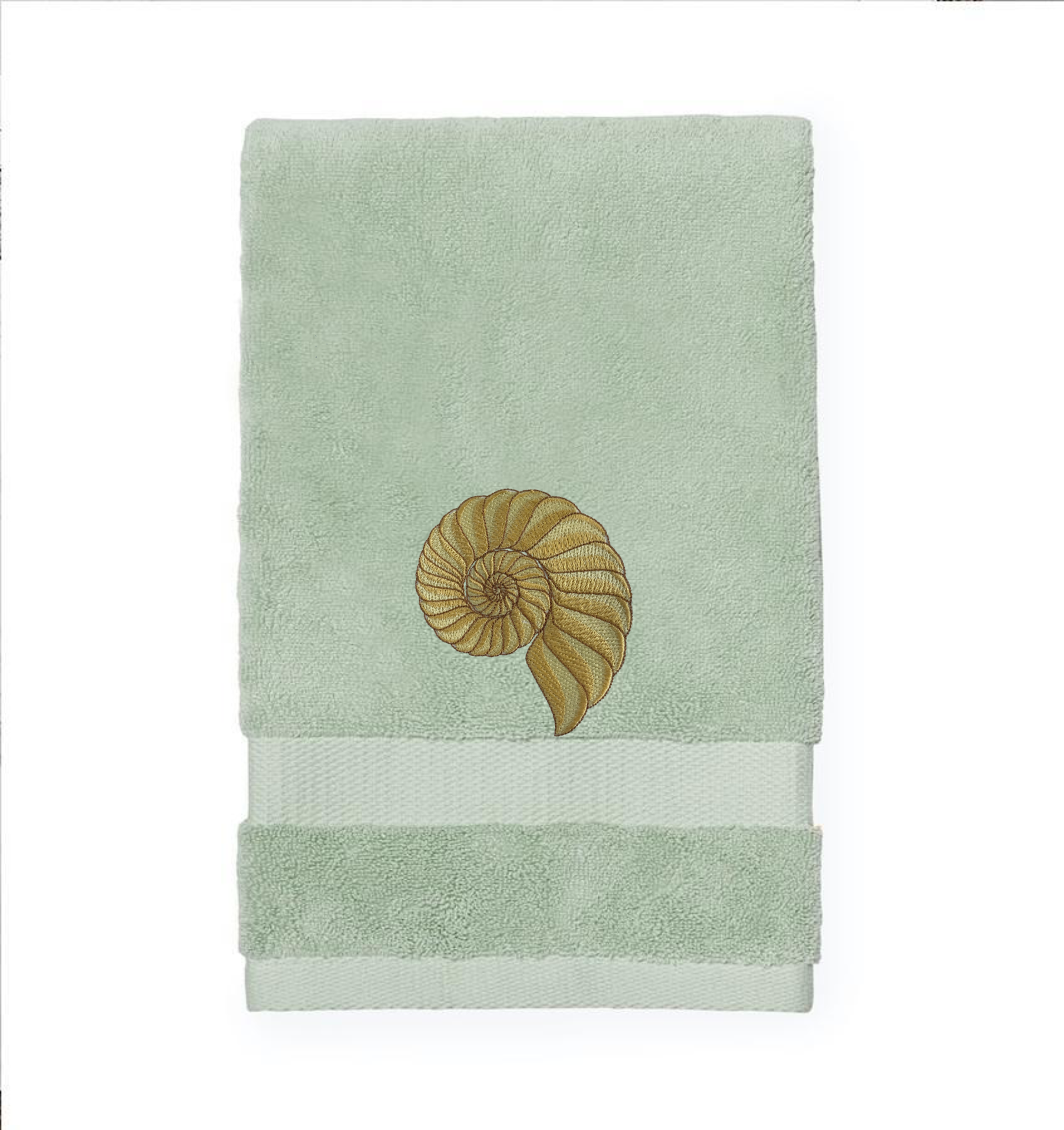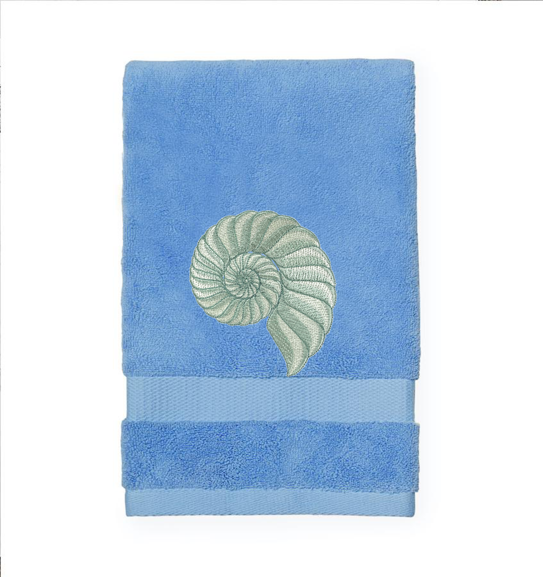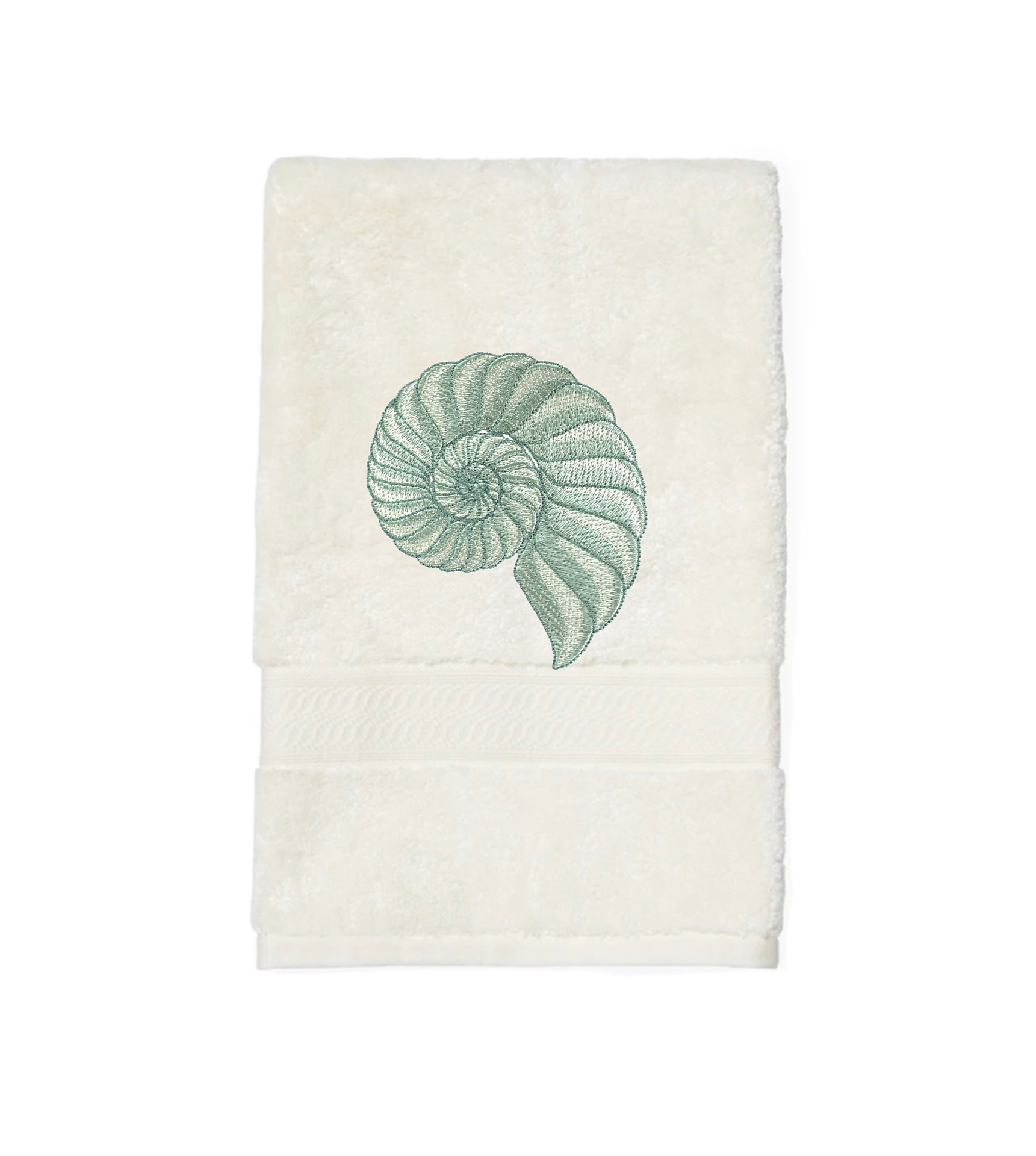 Embroidered Nautilus Shell Hand Towel. Elegant Nautilus in Beige or Green Embroidery with choice of towel color