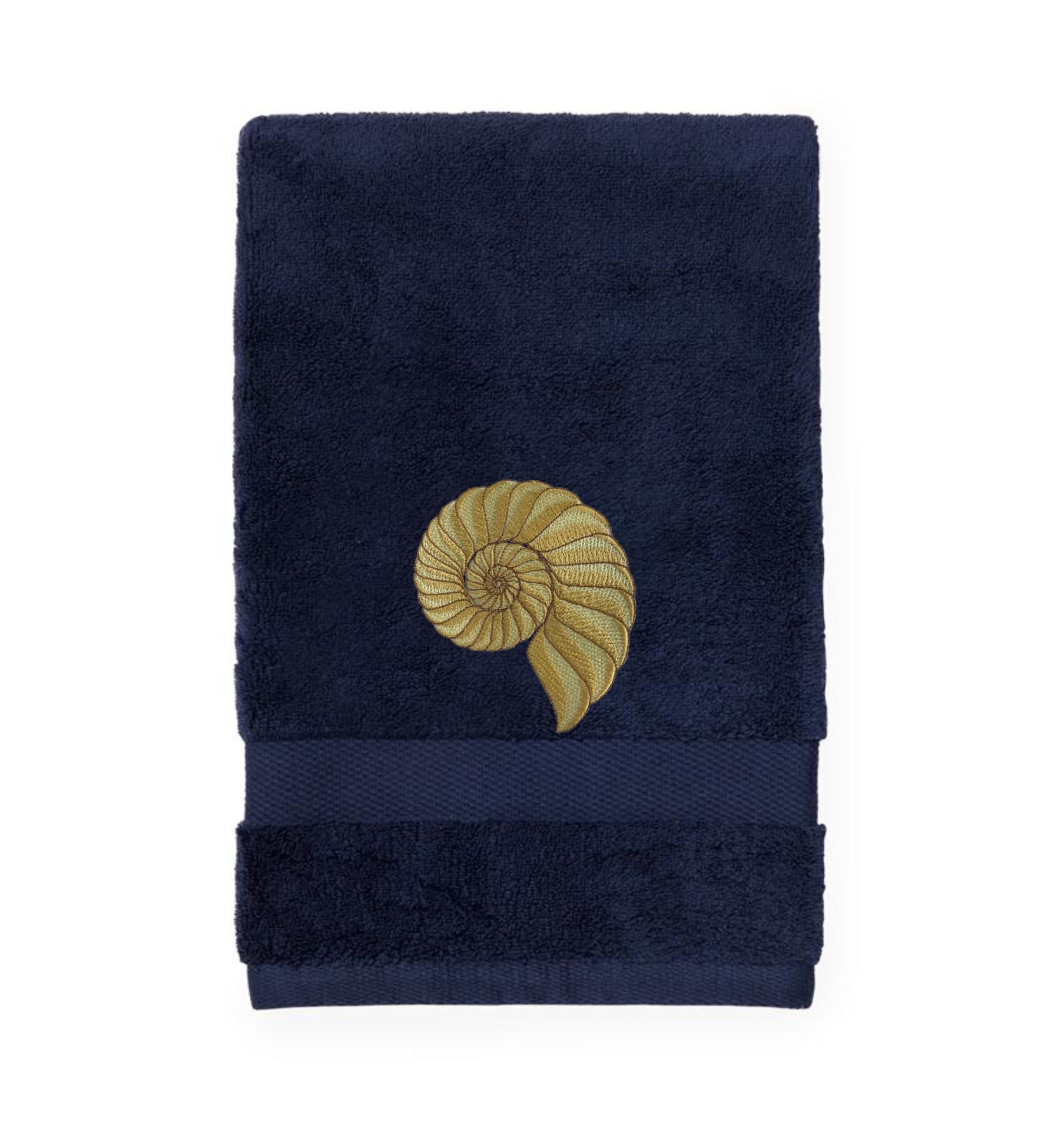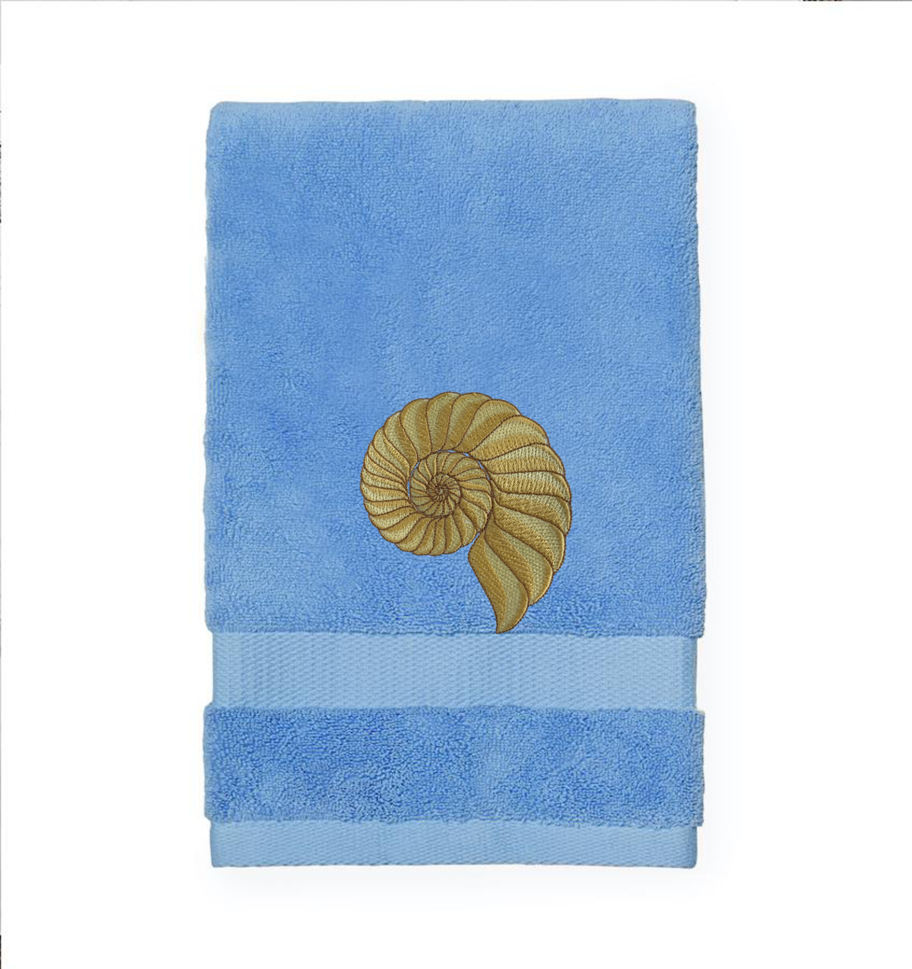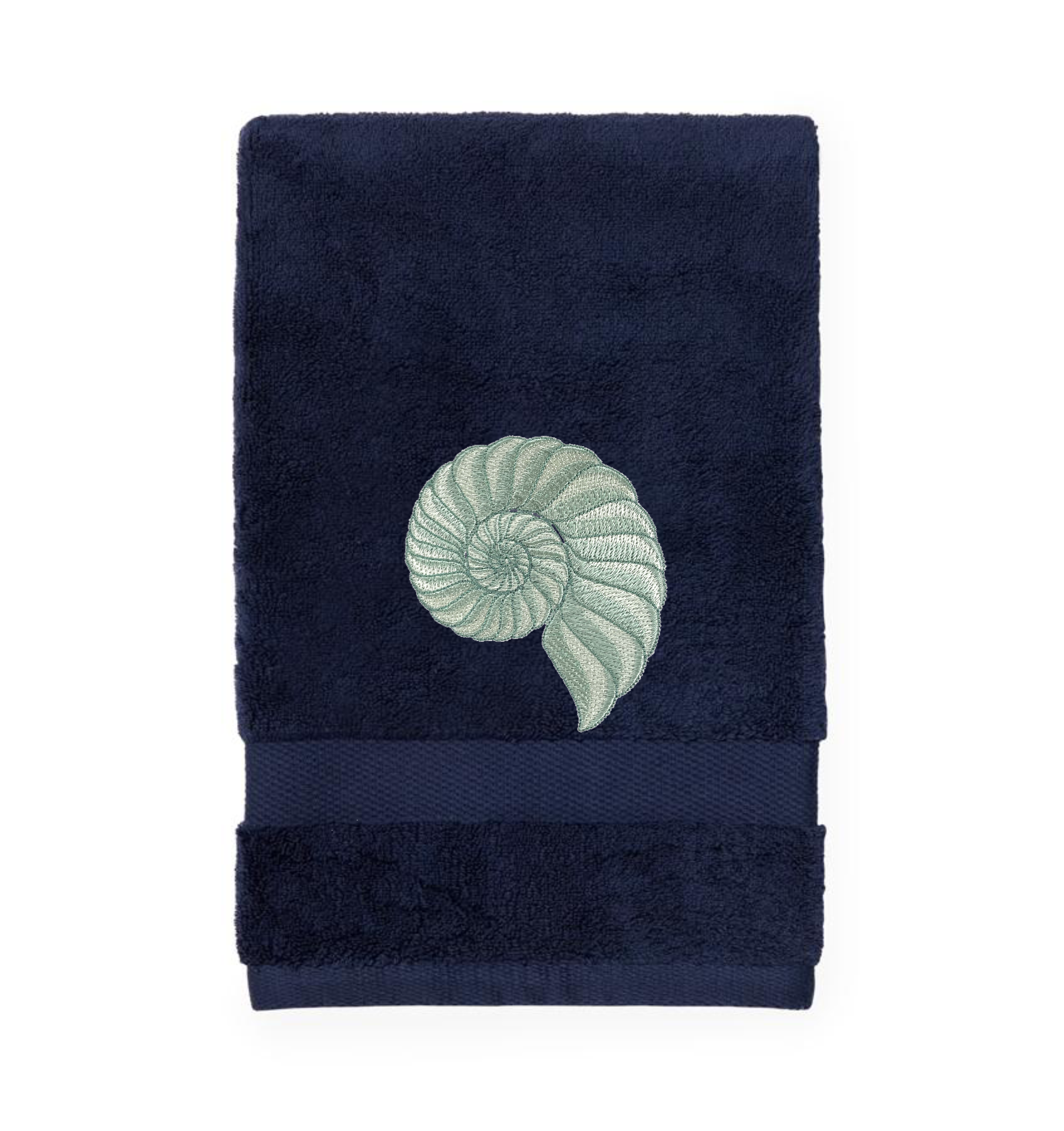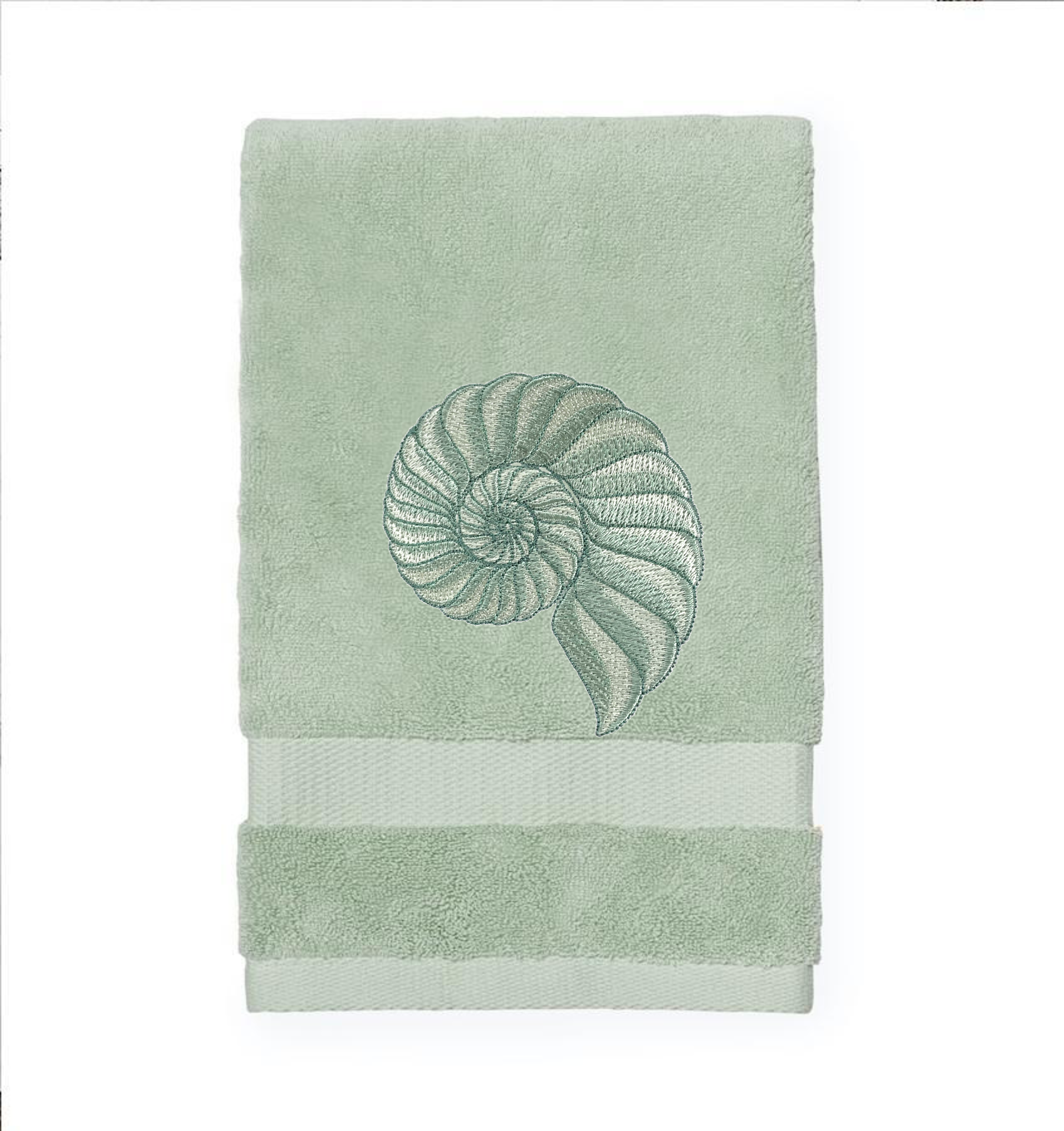 Embroidered Nautilus Shell Hand Towel. Elegant Nautilus in Beige or Green Embroidery with choice of towel color