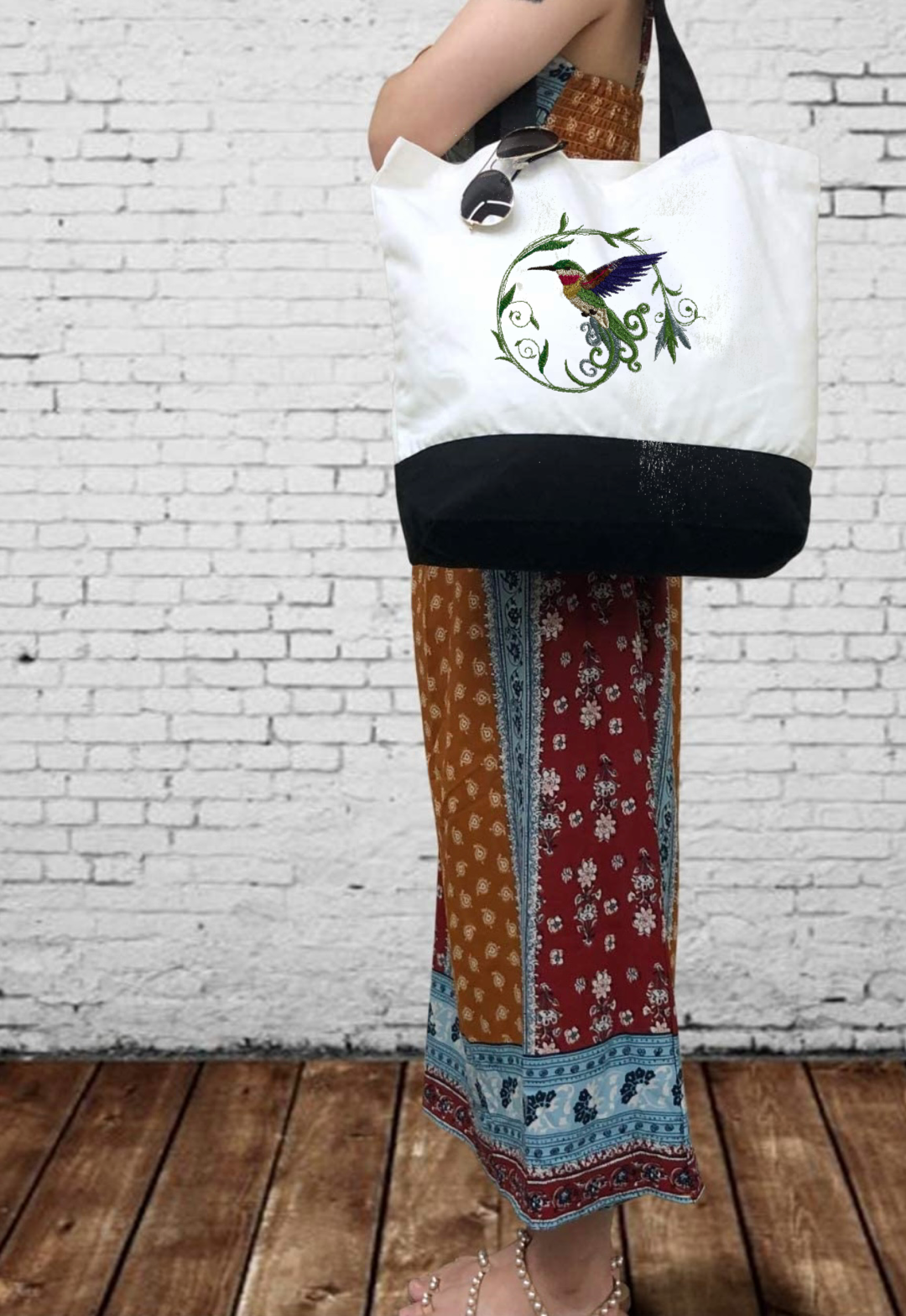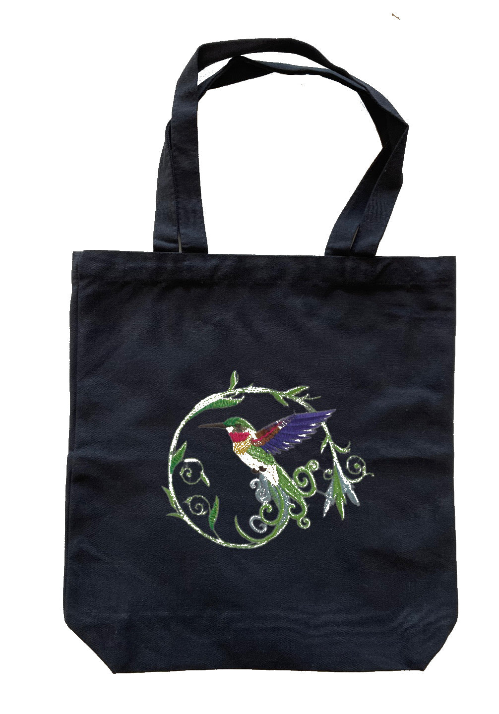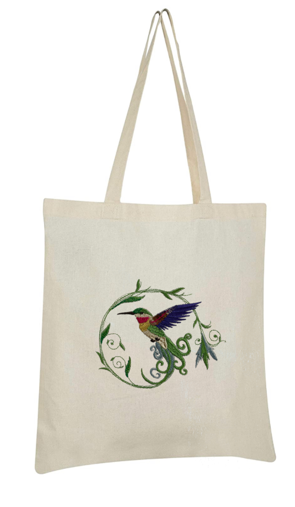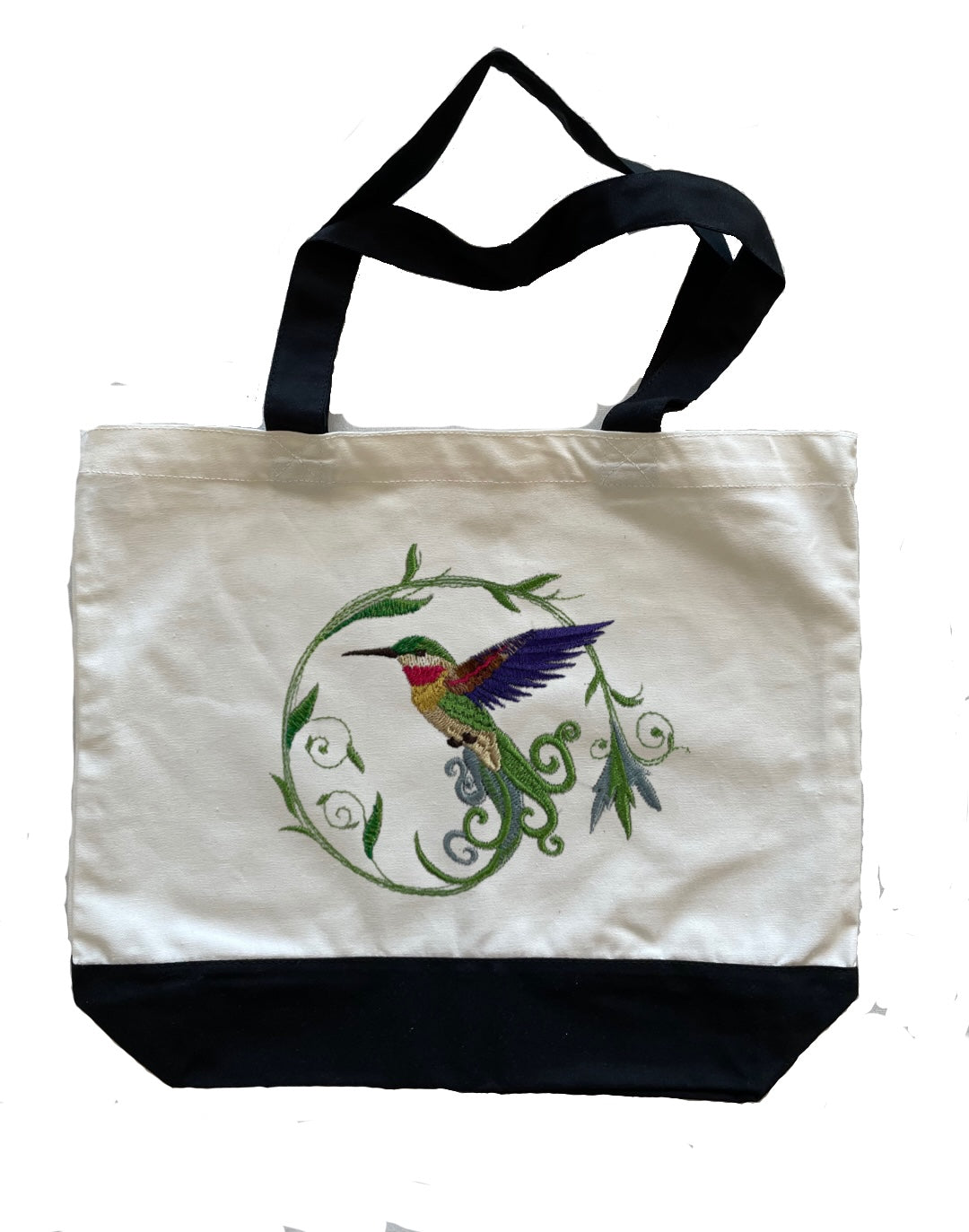 Cotton canvas tote / market bag. Unique detailed Hummingbird with long swirled tail embroidered on one side.