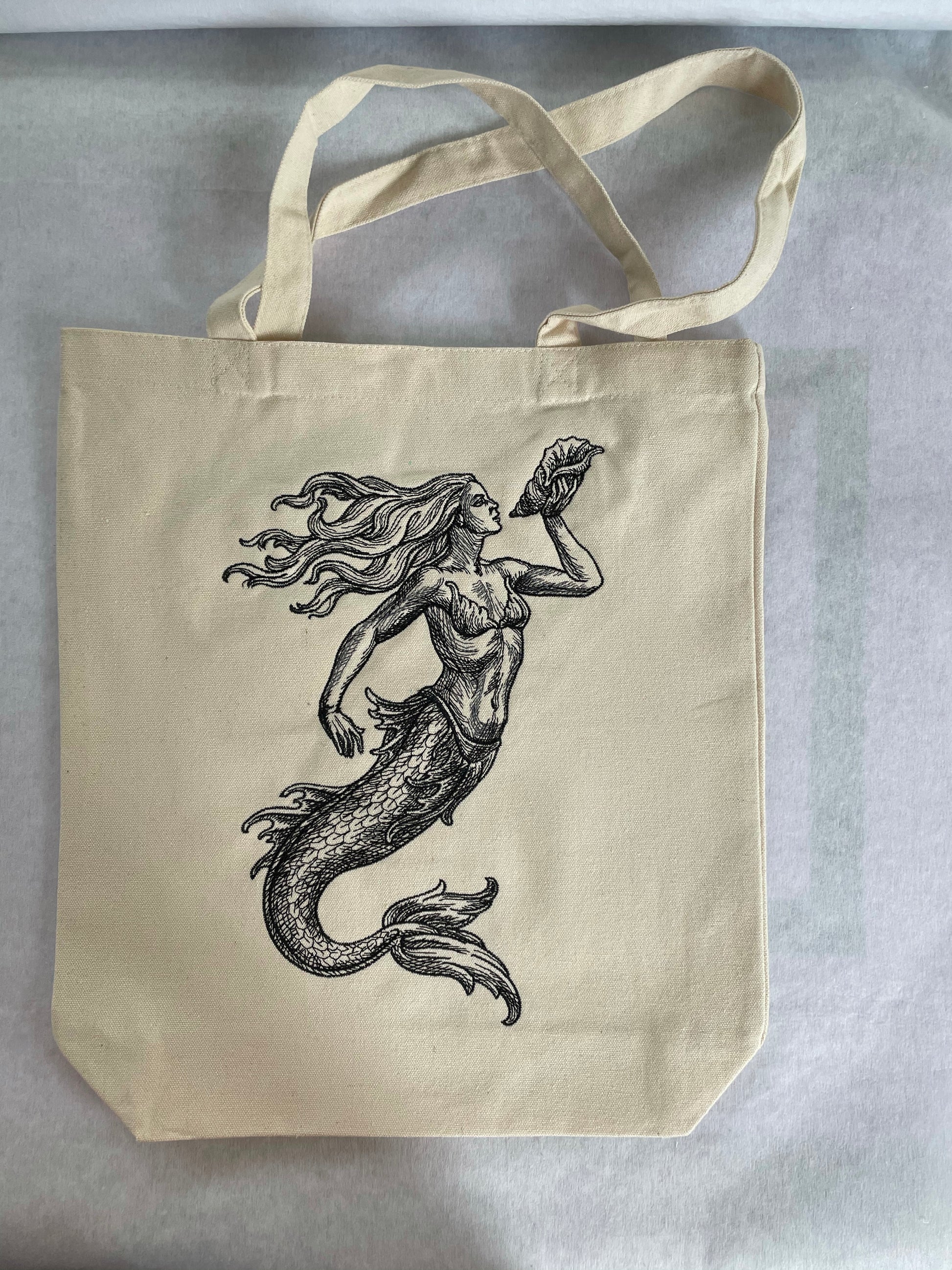 Perfect size canvas tote bag. Unique detailed Mermaid embroidered on one side.