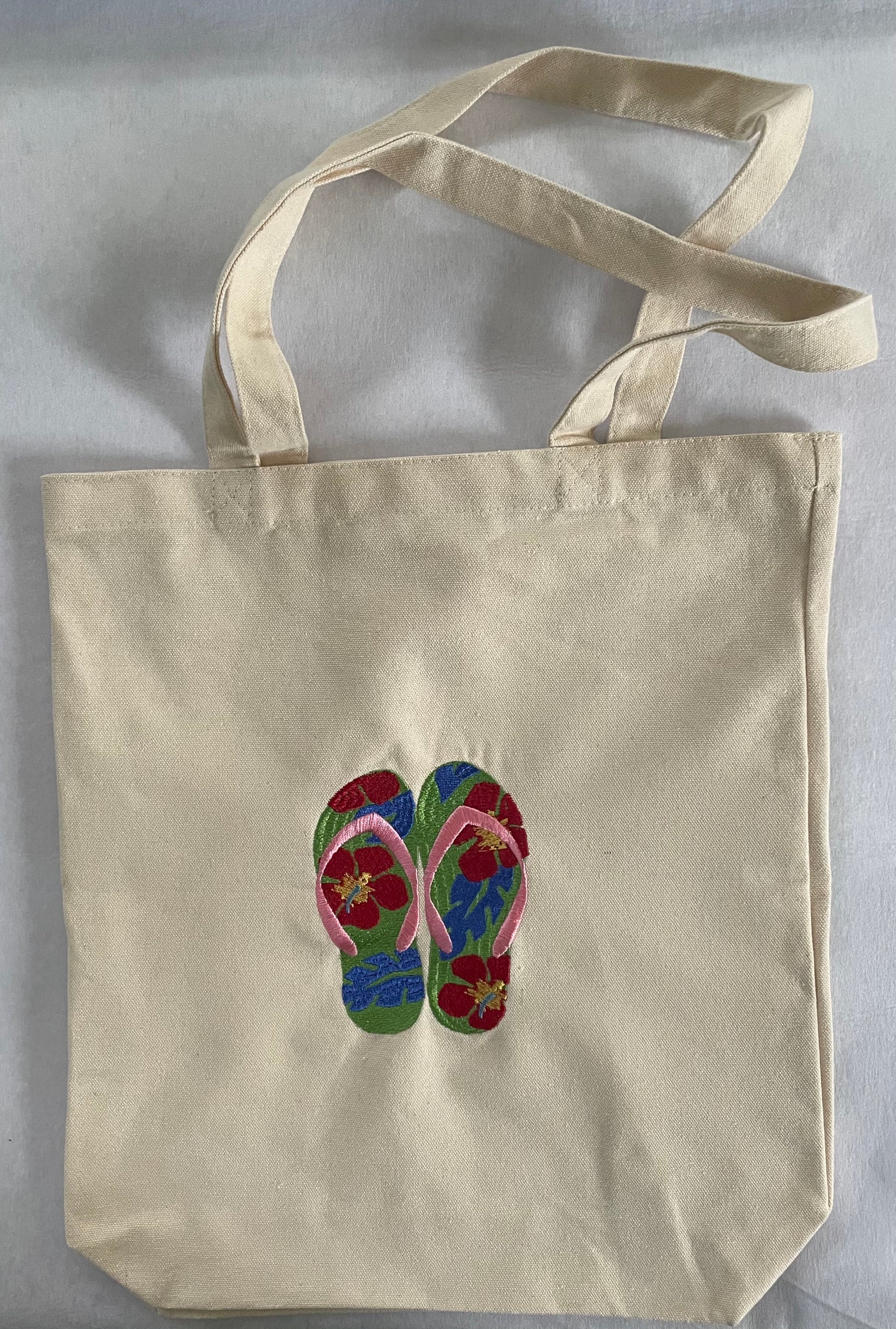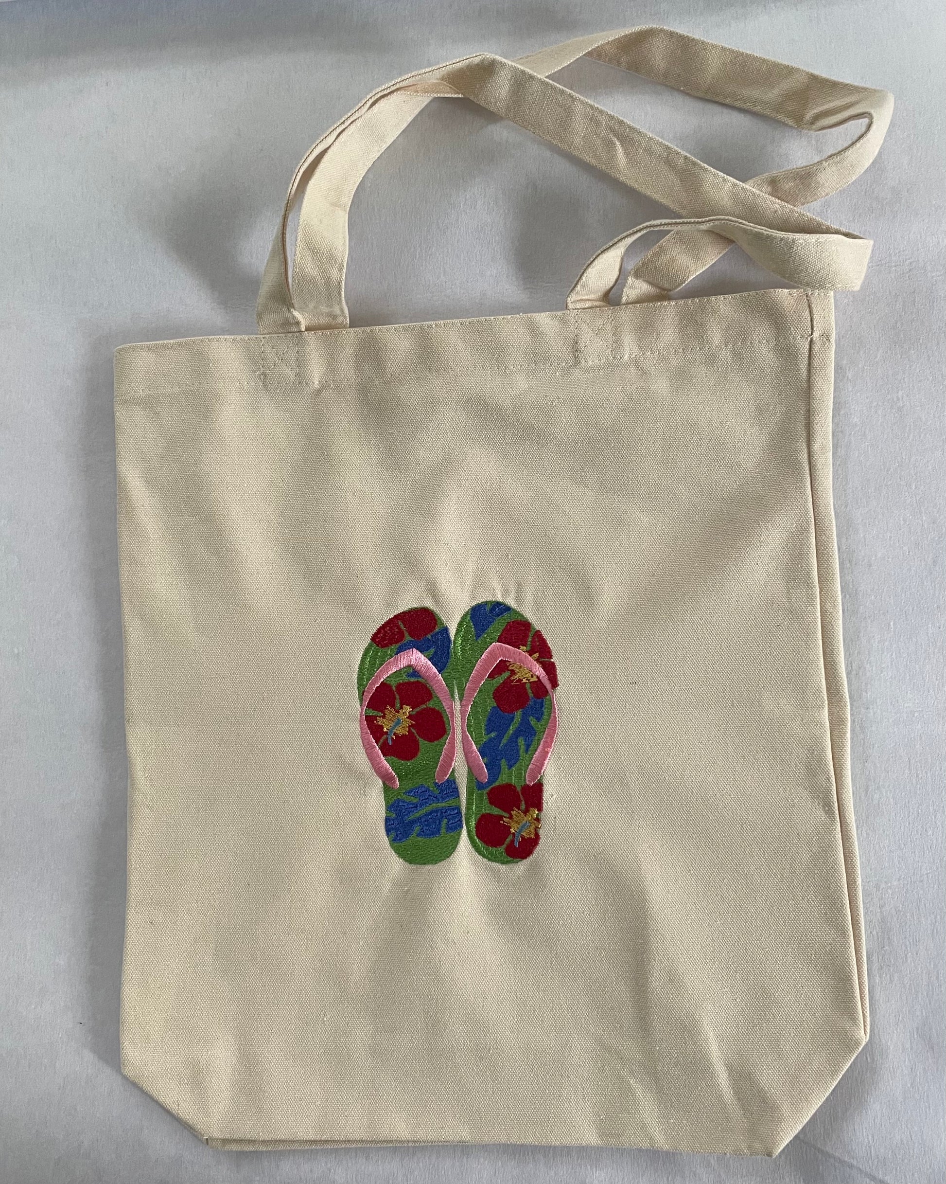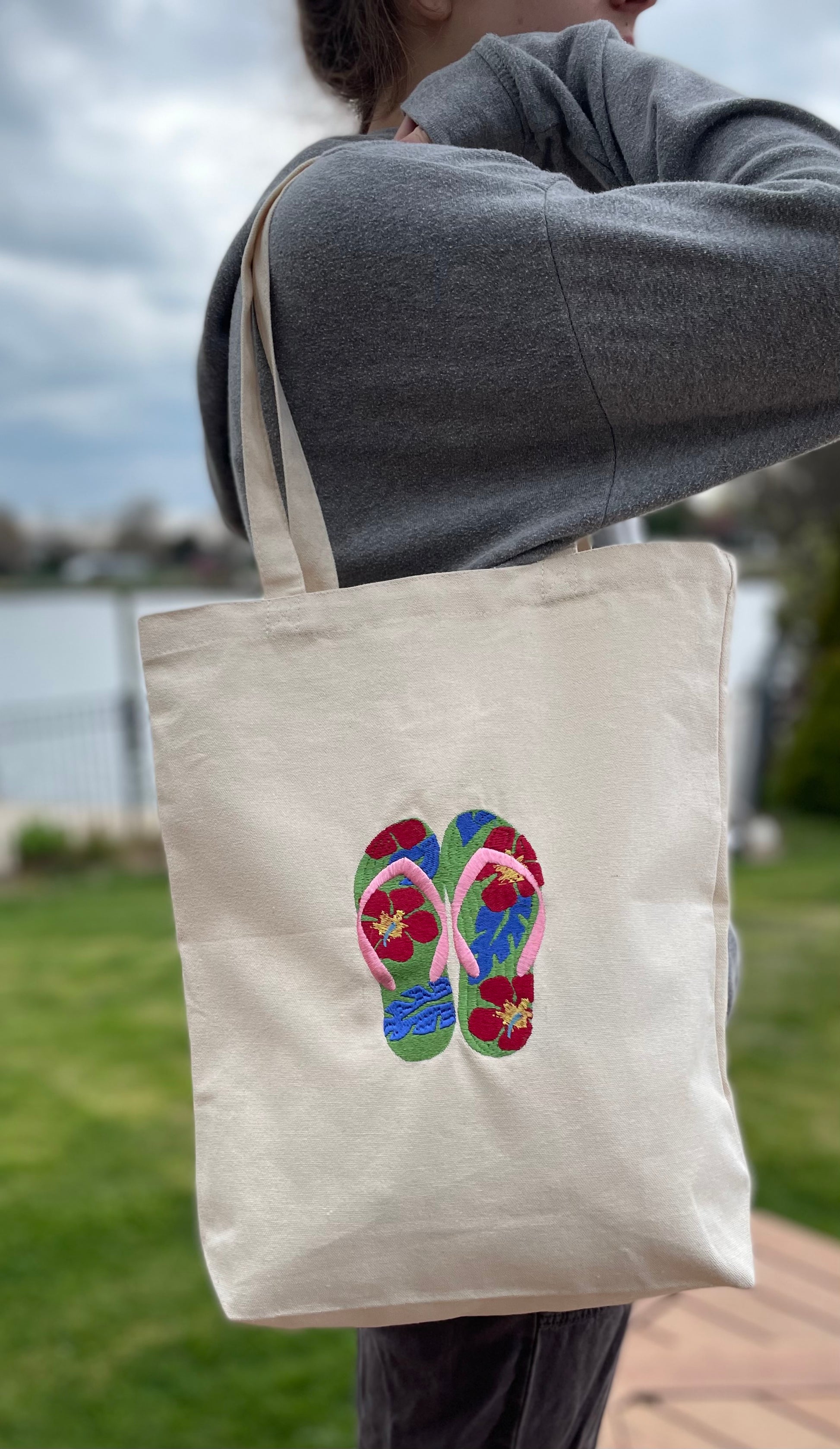 Perfect size canvas market bag. Tropical floral flip-flops embroidered on one side.